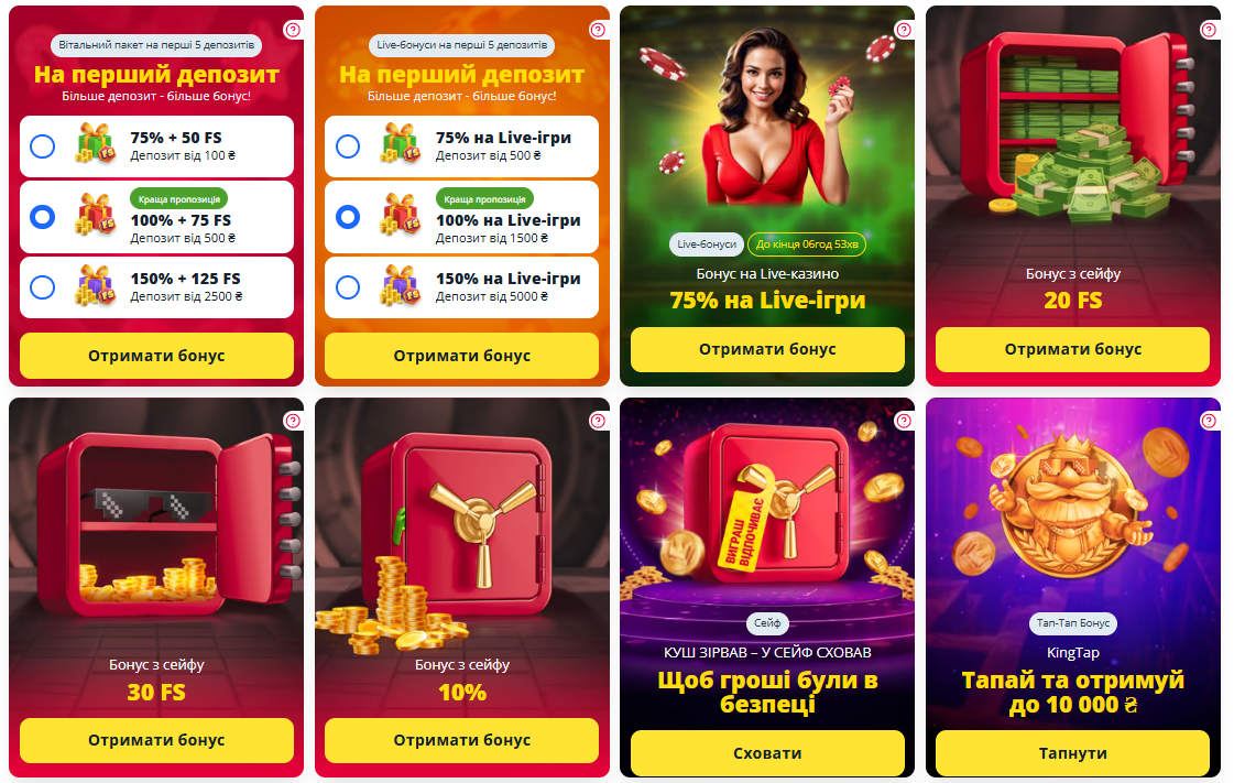 Общая сумма бонусов может достигать 125 000 грн, а количество фриспинов — 500. Минимальная сумма пополнения для получения бонуса составляет 100 грн. Бонусные средства необходимо отыграть с вейджером х40, а выигрыши от фриспинов — с вейджером х35.